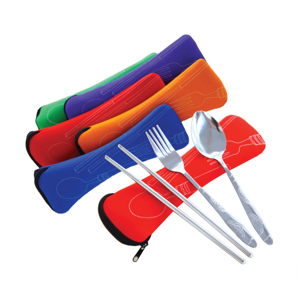 Durable, lightweight stainless steel 3 piece cutlery set (spoon, fork & chopstick). Great for traveling. Cutlery kept clean and compactly stored in stylish, washable neoprene case. Handy for office, car, boat, camping, scouts, caravan, holidaying and more.