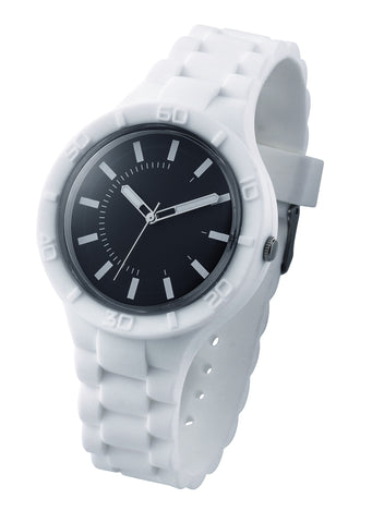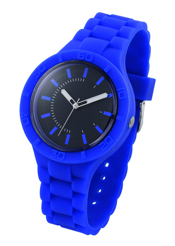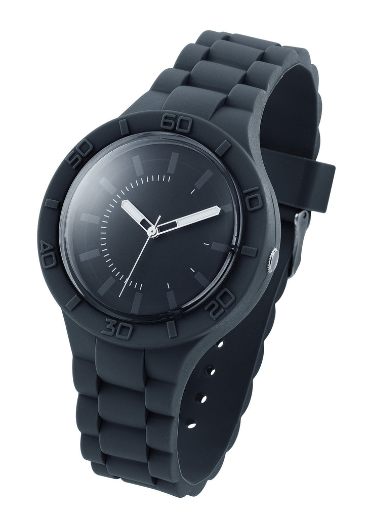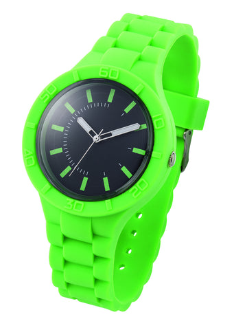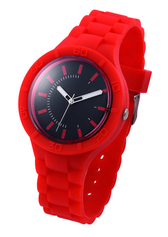 Stylish watch with silicone band and case, black dial,luminous hands and high accuracy quartz movement.Standard available in 6 trendy colors. Showerproof.