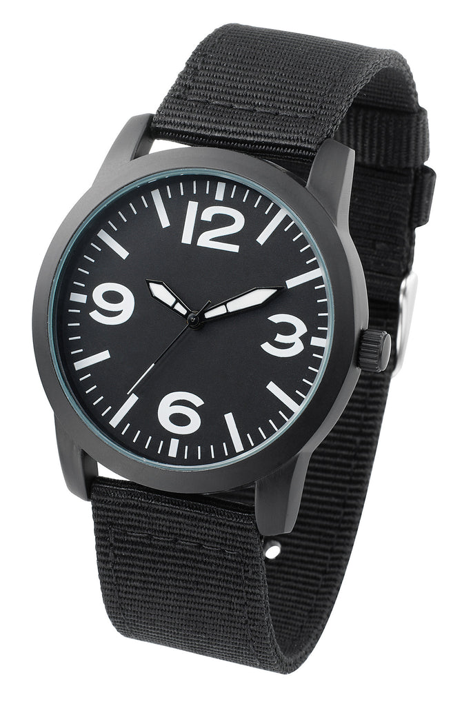 Stylish analog sports watch with black alloy case, black nylon strap, high accuracy quartz movement and luminous index and hands. Waterproof.