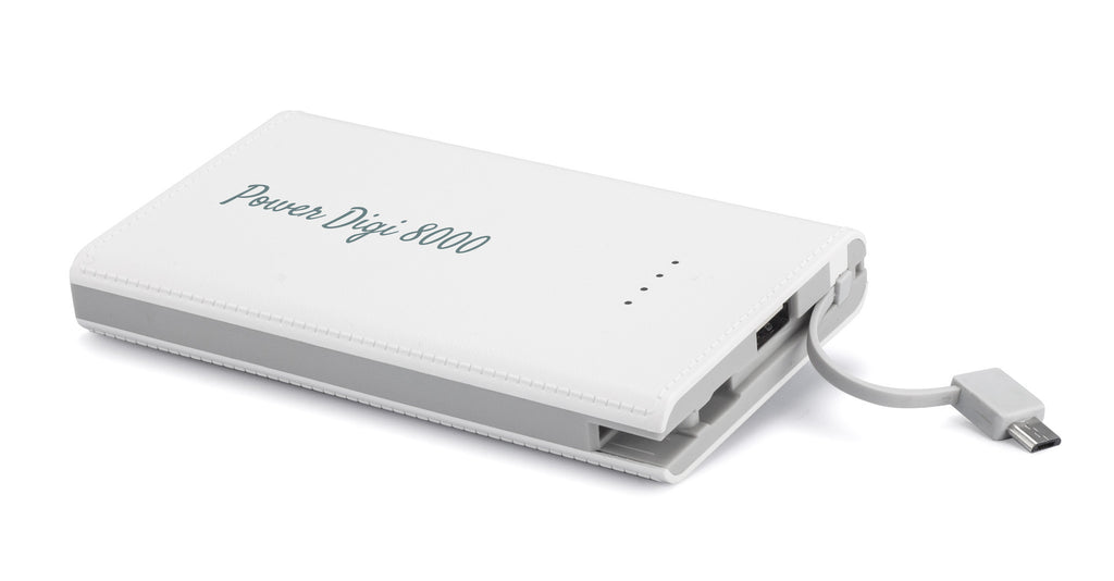 High capacity (8000mAh) power bank. Digital print on surface is available. Including micro USB charging cable.