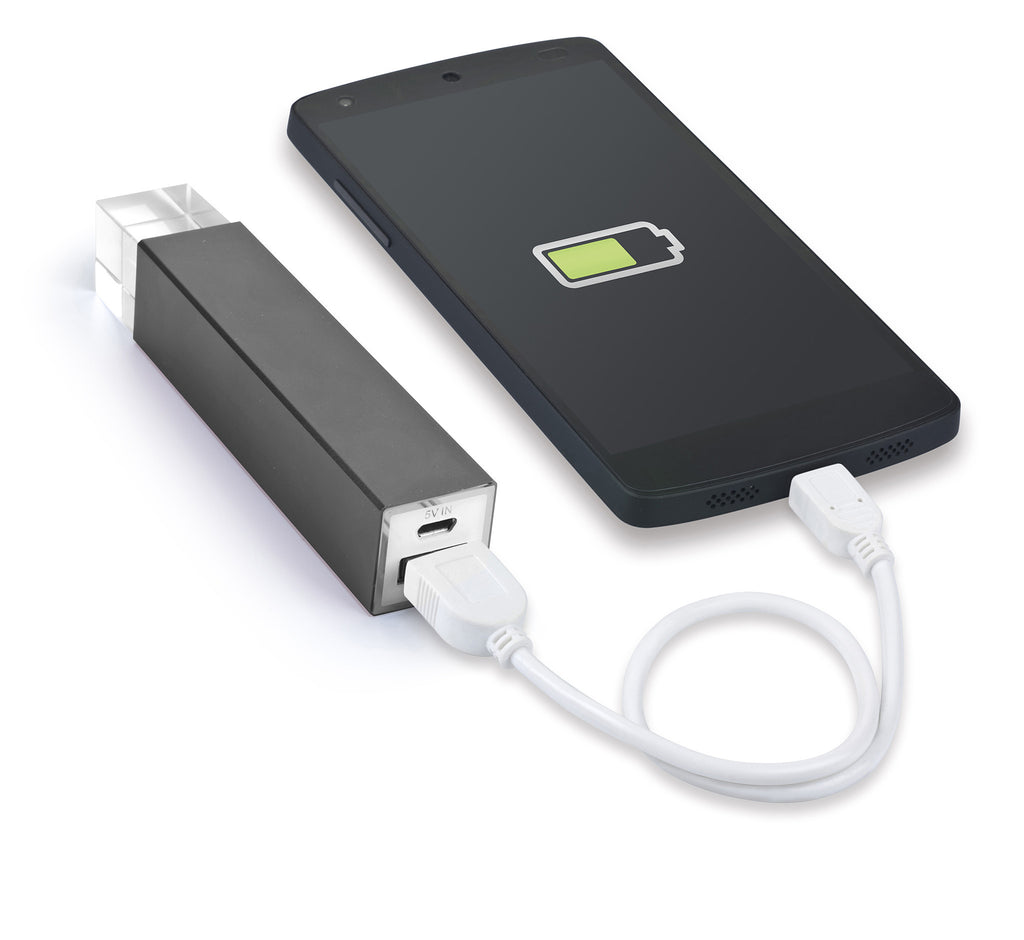 Not only does the Power Glow charge your smartphone or tablet in style, this powerbank also shines a light on your company logo. The grade A lithium-ion battery has a capacity of 2600 mAh with an input and output of 5V/1A. Including micro USB cable.