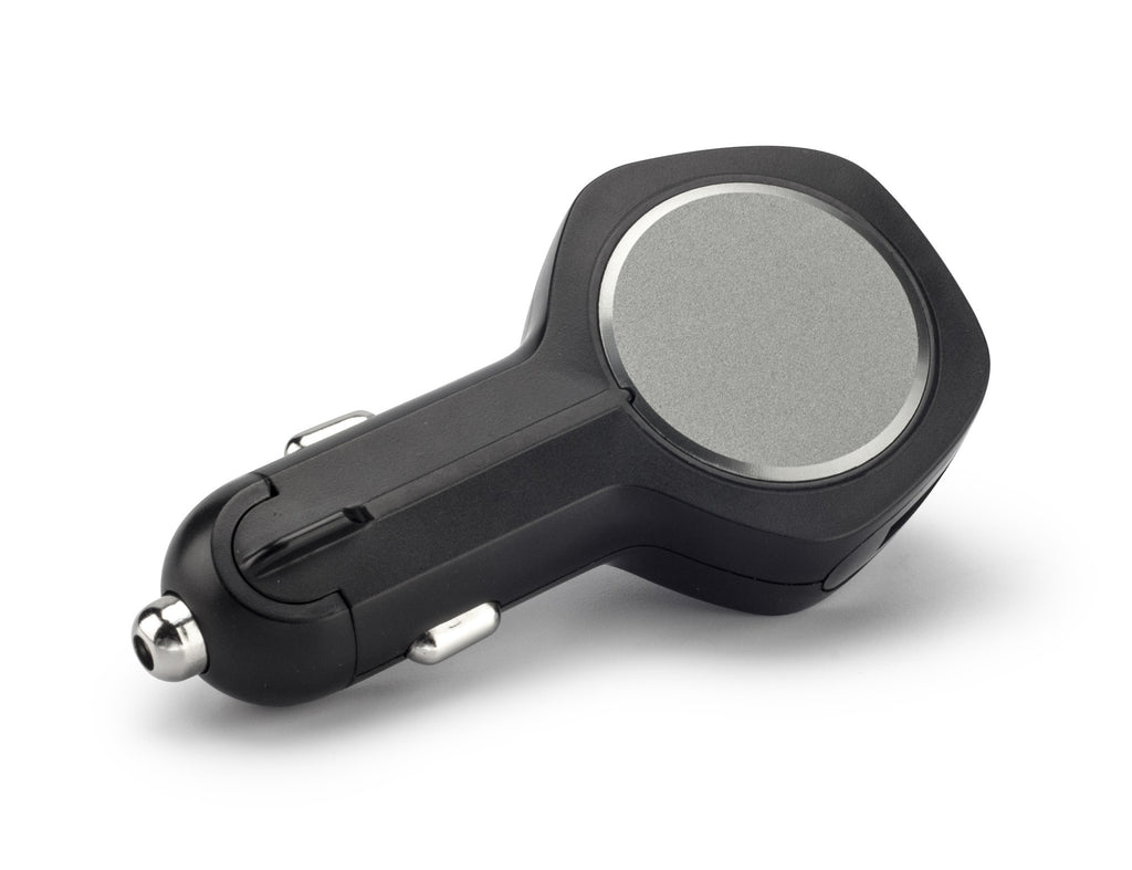Dual USB car charger with safety hammer to break window and cutter to cut seat belt in emergency. DC Input: 12V-24V; Output: 5V / 2.4A.