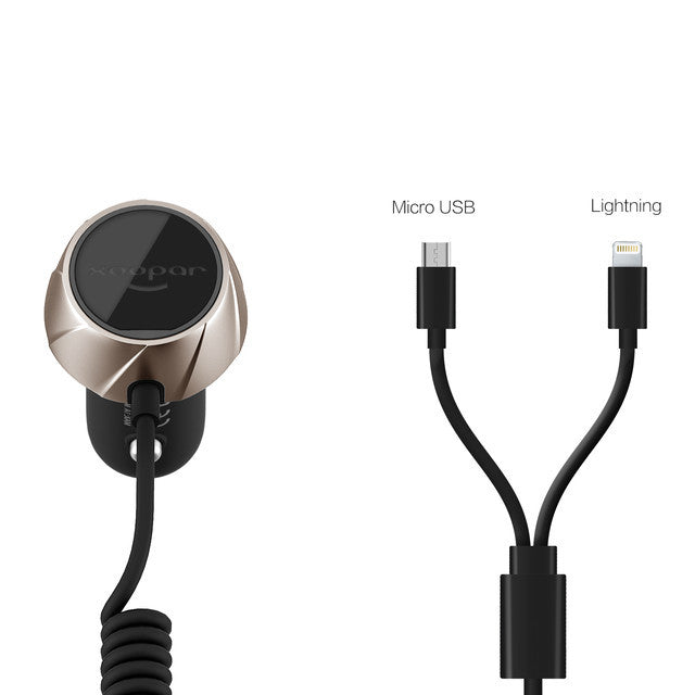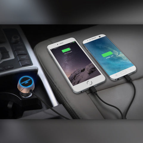 High Performance Car Charger, 2.4A output power provides express battery charging, Integrated micro USB and Lightning adapter, Over-Charge Protection, Brilliant swivel lighting logo.