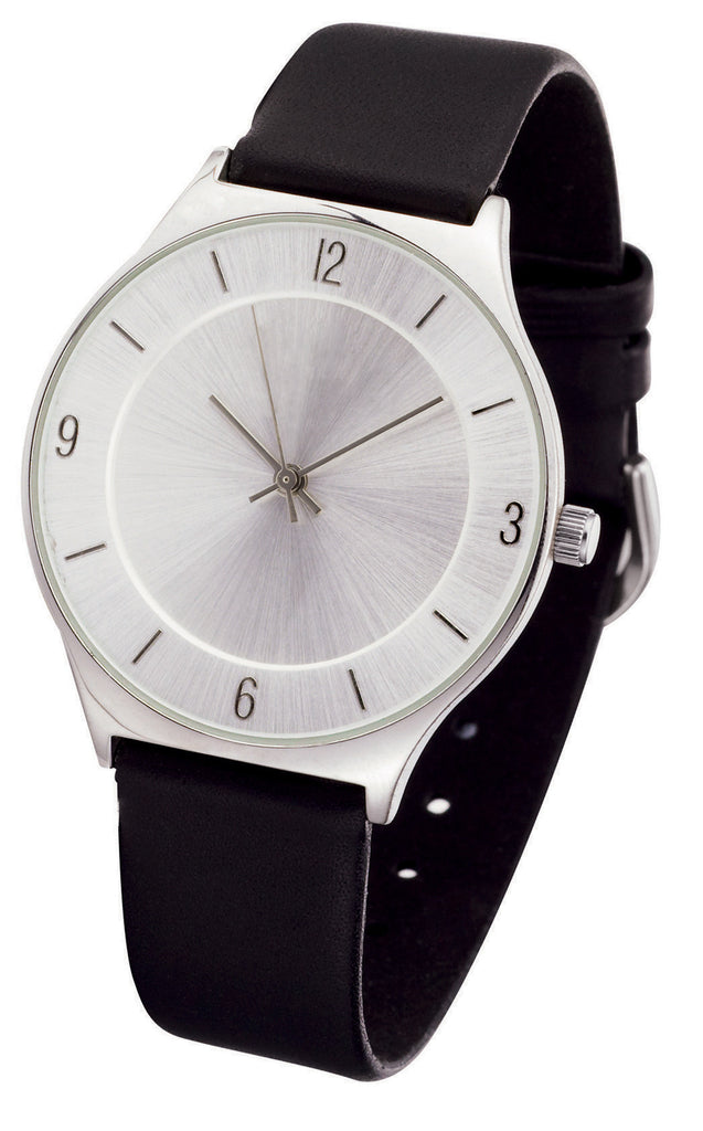 Elegant analog gents watch - high accuracy Japanese quartz movement - shiny finishing silver alloy case - genuine leather strap - raised index - sunray dial - showerproof construction.